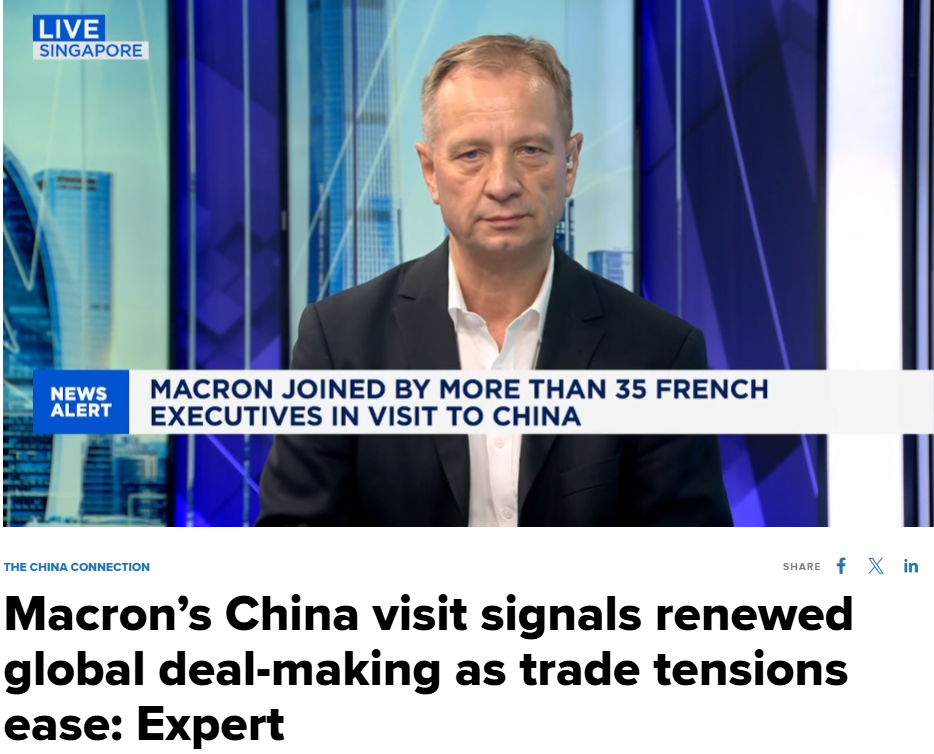 新加坡国立大学东亚研究所所长阿尔弗雷德·西雷德接受采访时认为,马克龙此访不仅有望取得重要商业成果,还将推动双方在欧中贸易中长期重要的关键问题上寻求突破。